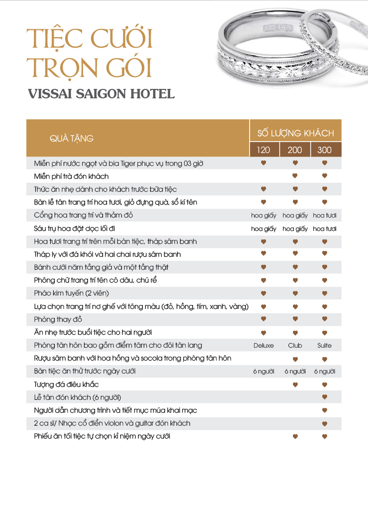 Tổ chức tiệc cưới không chỉ là trao nhau lời tuyên thệ mà còn là ngày trọng đại để bạn chia sẽ niềm vui, niềm hạnh phúc cùng người thận và gia đình. Tại khách sạn Vissai Saigon đội ngũ nhân viên giàu kinh nghiệm cùng với cách sắp xếp và phục vụ chu đáo sẽ làm cho ngày vui trọng đại của bạn thêm phần ý nghĩa.